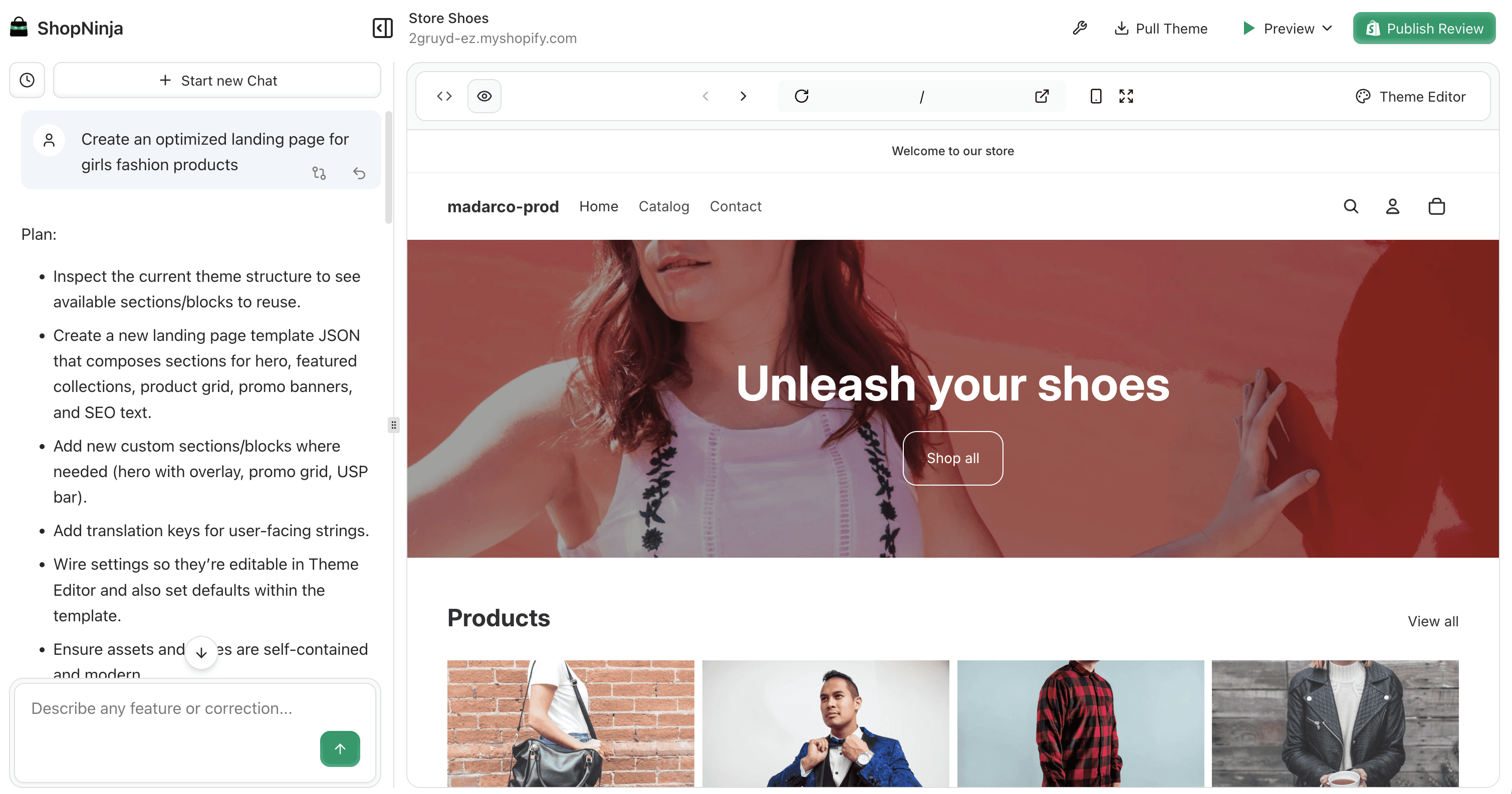 ShopNinja generates the structure, connects it with your data, and gives you the option to tweak everything visually before publishing.